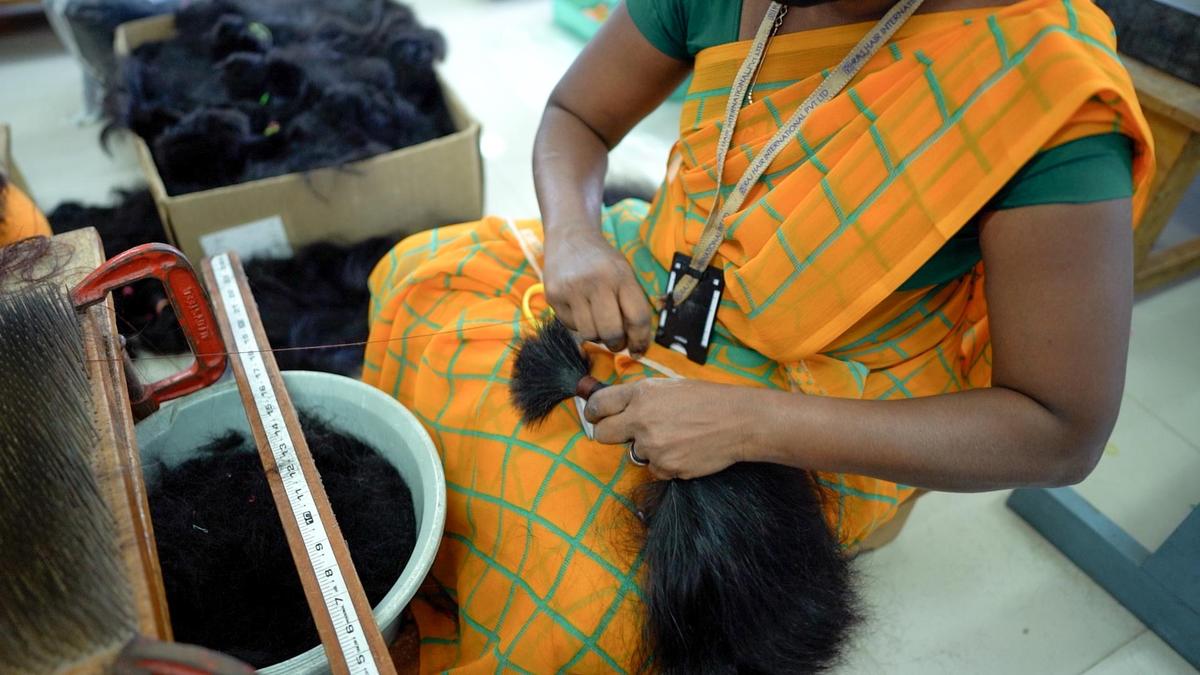 চেন্নাইয়ের কাছে আলিনজিভাক্কামের একটি ইউনিটে, নীল রঙের ট্রেগুলির সারিগুলিতে চুলের টুকরো পড়ে আছে। তারপরে তারা একটি কঠোর 14-পদক্ষেপ প্রক্রিয়ার মধ্য দিয়ে যায় যার মধ্যে বাছাই করা, ধোয়া, শুকানো, রঙ, গঠন এবং দৈর্ঘ্যের উপর ভিত্তি করে আলাদা করা, সেলাই এবং গিঁট অন্তর্ভুক্ত রয়েছে। একটি পরচুলা তৈরি করতে 10 থেকে 14 দিন সময় লাগে। এবং শীঘ্রই তারা সারা দেশে ক্যান্সার যোদ্ধাদের কাছে পৌঁছানোর একটি উপায় খুঁজে পেয়েছে। আমরা চেরিয়ান ফাউন্ডেশনের পরচুলা তৈরির ইউনিটে আছি, যেখানে 60 জনের একটি দল গত 10 বছর ধরে ক্রমাগত হাতে পরচুলা তৈরি করছে।