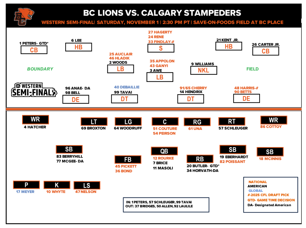 BC লায়ন্স (11-7) পশ্চিম সেমি-ফাইনালে ক্যালগারি স্ট্যাম্পেডার্স (11-7) হোস্ট করবে শনিবার, 1 নভেম্বর বিসি প্লেস স্টেডিয়ামে, বিকাল 5:30 টায় কিকঅফ সহ। ইডিটি। স্ট্যাম্পেডার্স তাদের নিয়মিত মৌসুমের শেষ তিনটি গেম জিতেছে, যার মধ্যে এডমন্টন এলক্সের বিরুদ্ধে 20-10 জয় রয়েছে, যেখানে লায়ন্স গত সপ্তাহে সাসকাচোয়ান রফরাইডার্সকে পরাজিত করে পশ্চিম বিভাগের অবস্থানে দ্বিতীয় স্থানে চলে গেছে।
