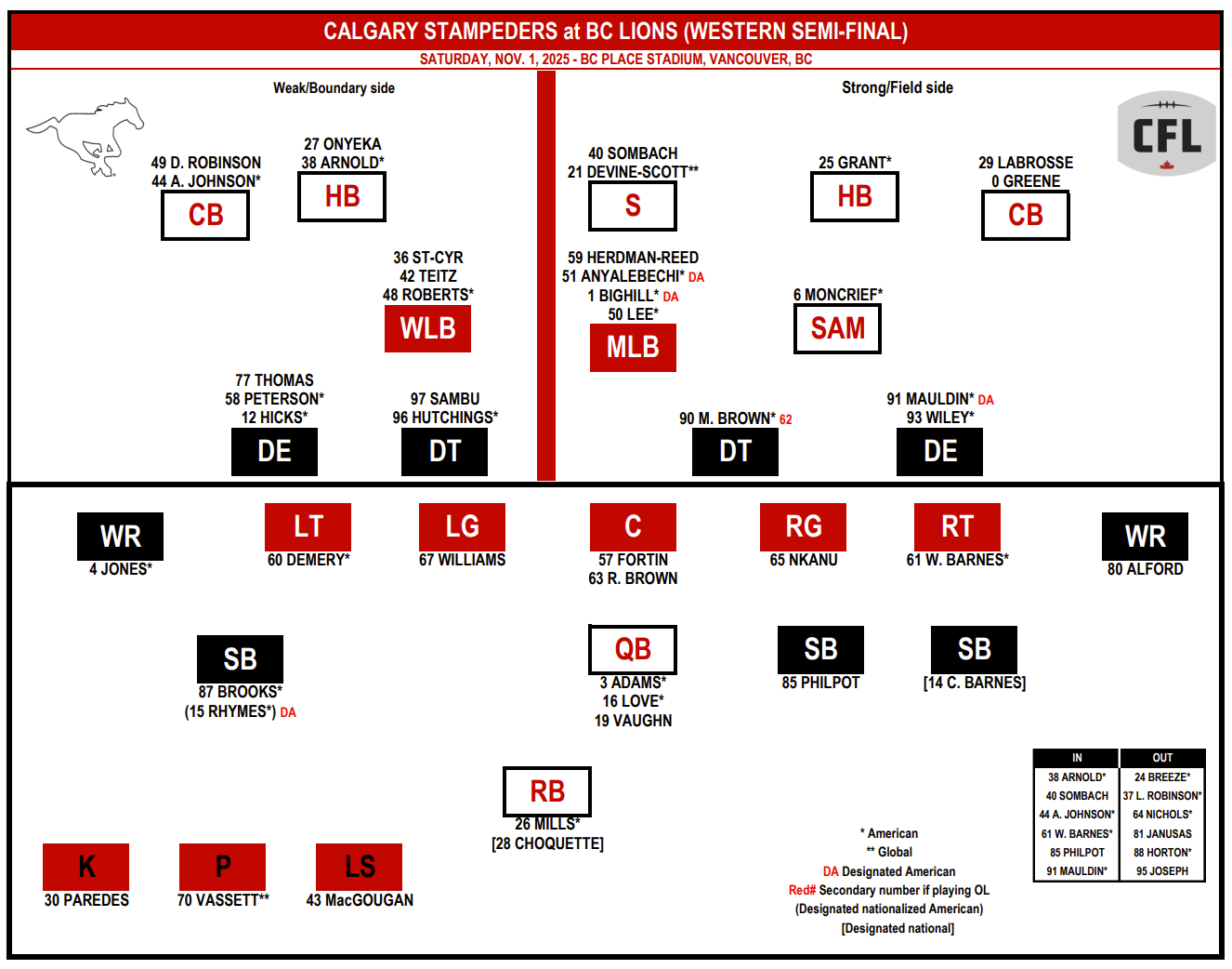 ক্যালগারি স্ট্যাম্পেডার্স (11-7) পশ্চিম সেমি-ফাইনালে বিসি লায়ন্স (11-7) এর সাথে শনিবার, 1 নভেম্বর বিসি প্লেস স্টেডিয়ামে, বিকাল 5:30 টায় কিকঅফের সাথে মুখোমুখি হবে। ইডিটি। স্ট্যাম্পেডার্স তাদের নিয়মিত মৌসুমের শেষ তিনটি গেম জিতেছে, যার মধ্যে এডমন্টন এলক্সের বিরুদ্ধে 20-10 জয় রয়েছে, যেখানে লায়ন্স গত সপ্তাহে সাসকাচোয়ান রফরাইডার্সকে পরাজিত করে পশ্চিম বিভাগের অবস্থানে দ্বিতীয় স্থানে চলে গেছে।
